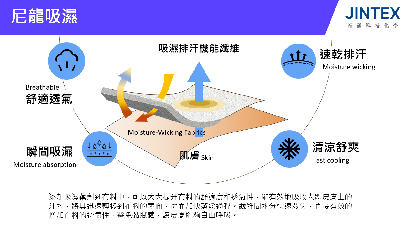 This line includes two products, Jintex QDN-817 and JintexBio NPU-913, both specifically designed for nylon materials to significantly enhance moisture absorption and durability.